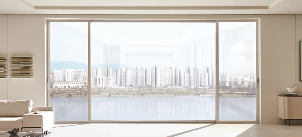 비행기 문처럼 닫히는 P/S(Parallel Sliding) 시스템과 4중 유리 단창의 조합은 외부의 소음과 냉기를 완벽히 차단하고, 실내의 쾌적한 공기는 지켜줍니다. 이를 통해 ‘따뜻하고 조용한 통창뷰’라는, 이전에 없던 주거 경험을 선사합니다.